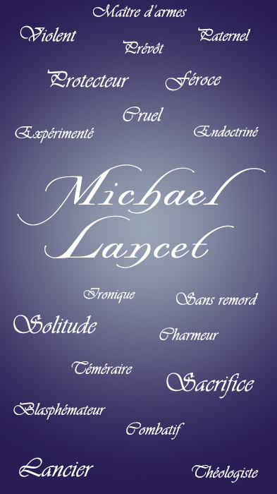 Maître d’arme dans l’école la plus réputée de Darkwood, Lancet porte ses quarante trois ans sans une ride. Son sens du devoir a fait sienne la devise de son ordre religieux : « sacrifice et solitude ».