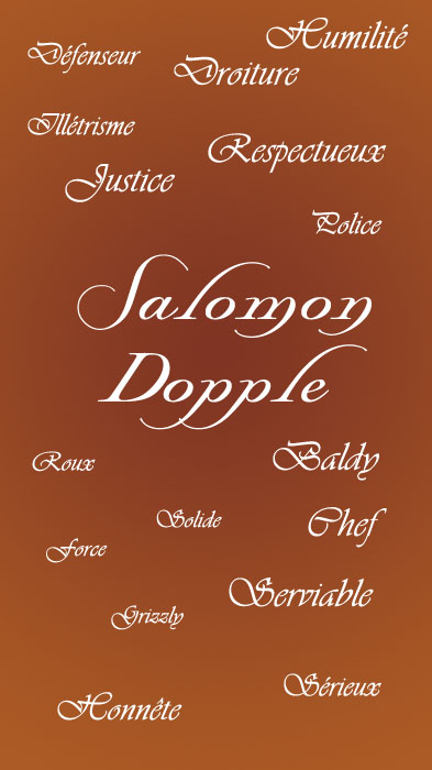 Salomon Dopple a le garde de « Chef » parmi les baldies de la police de Darkwood. Géant aux allures de grizzli, il n’est pas homme à se servir de ses poings, si la situation peut être gérée autrement. Si sa scolarité a été brève, il n’a pas besoin de livres pour savoir inspirer confiance, tirer le meilleur de ses subalternes et d’être indispensable pour ses supérieurs hiérarchiques. Les inspecteurs détectives Rhys Overlake et Airon Offlight pourront compter sur lui.